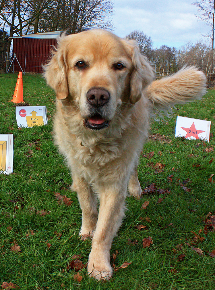 Du und dein Hund durchlauft gemeinsam einen Parcours. An jeder Station findet ihr ein Schild mit einer Aufgabe, die ihr zusammen meistert – z. B. Sitz/Platz-Kombinationen, Wendungen, Kreise oder ein „Bleib“. Eine besondere Herausforderung: das „Futterverweigern“, bei dem dein Hund gefüllte Näpfe ignorieren muss.